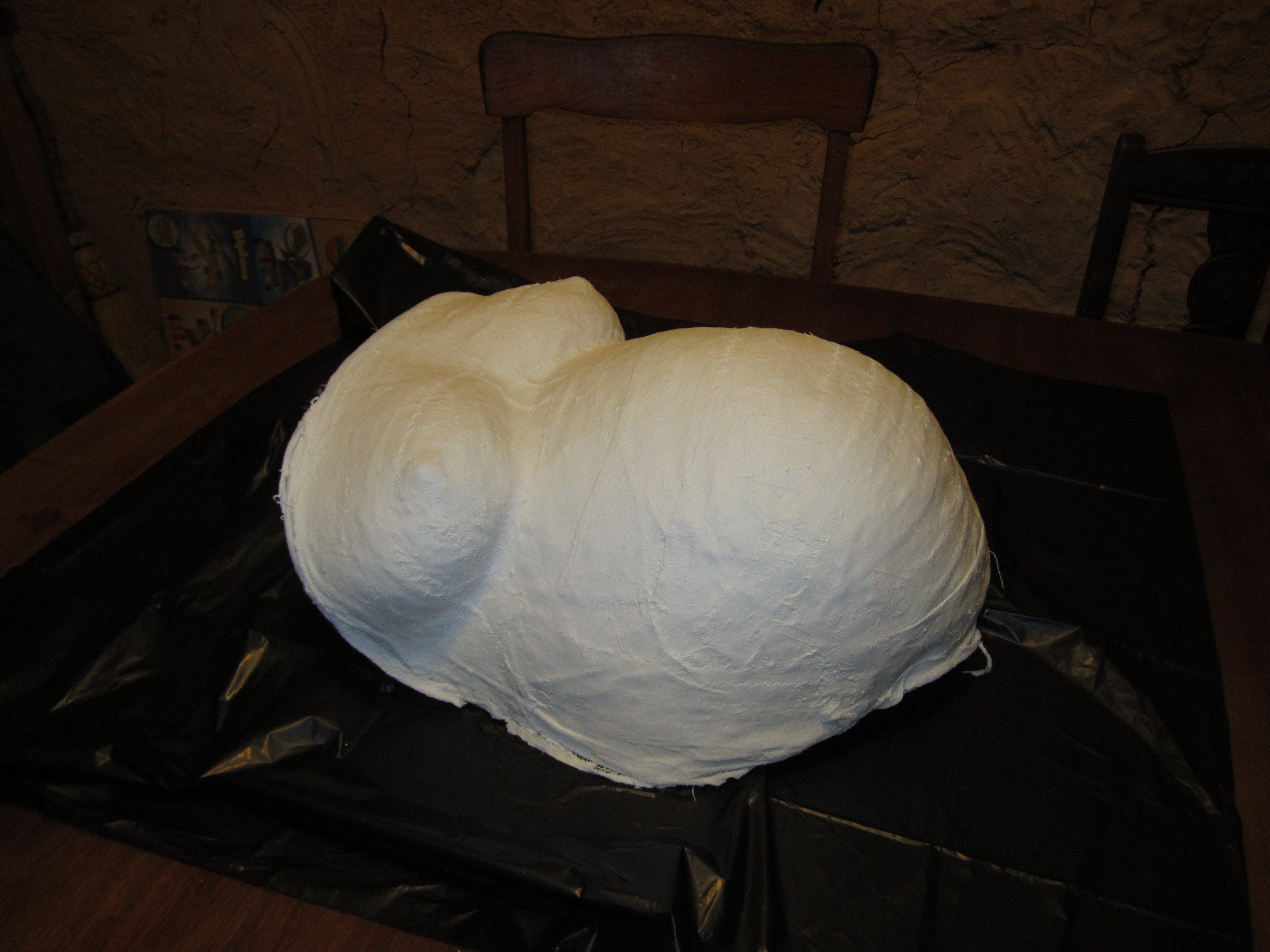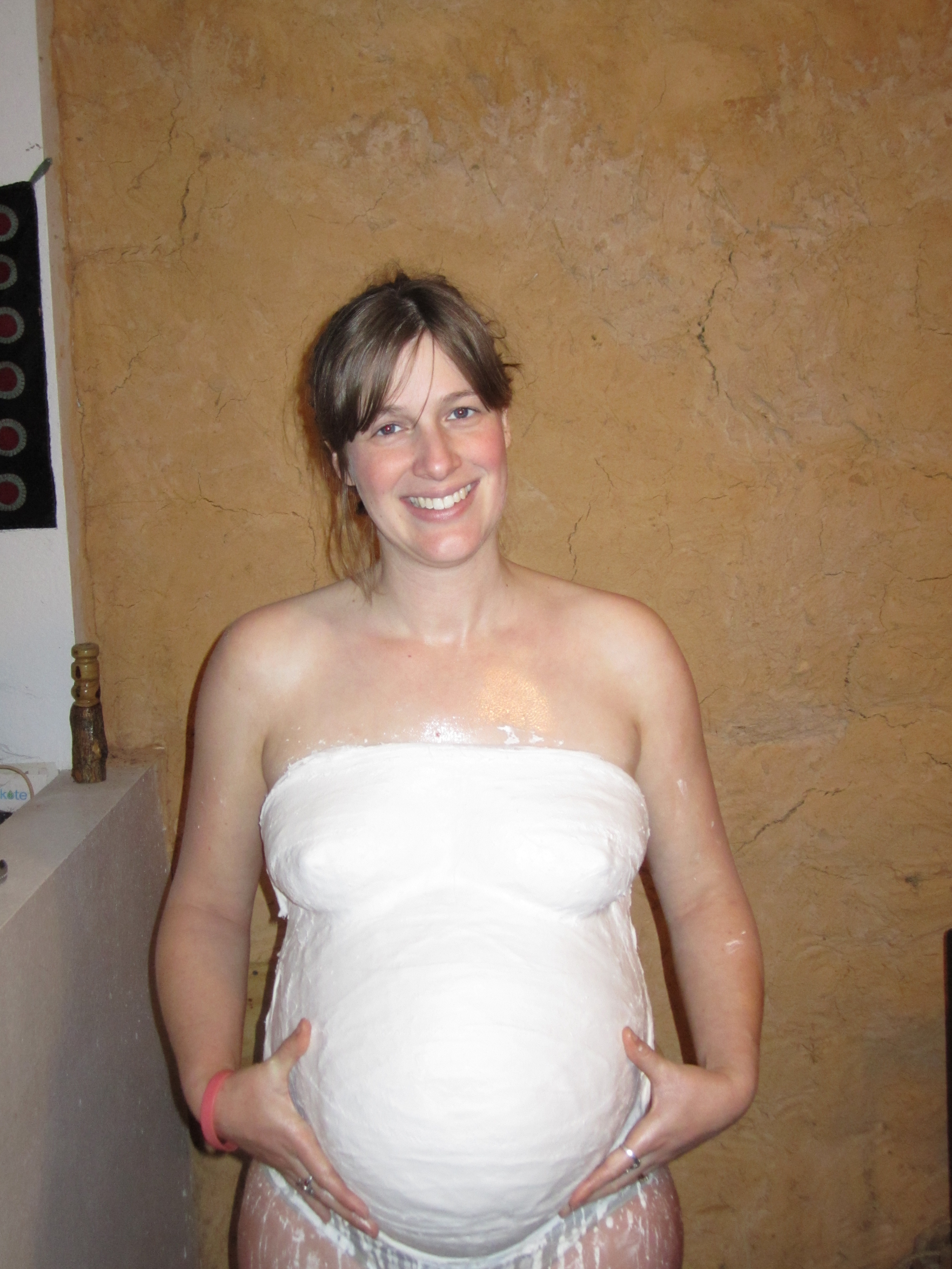 belly cast in January! Yikes! My only other casting experience was in May (2006)—very different. For this one, we decided to make it with me standing up (for fullest shape) and so I stood in front of the furnace vent, but it didn’t help much. Even though the water was warm, it quickly chilled down as soon as the plaster was applied and ran in slow torturous trickles into my underwear and then