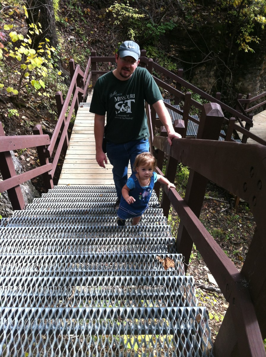 Mini Vacation 105 Oct16 Published at 1936 × 2592 in Grand Gulf/Mammoth Spring Mini-Vacation ← Previous Next → Coming back up the stairs. She climbed all the way! (119 steps, theoretically, 130 feet down!)