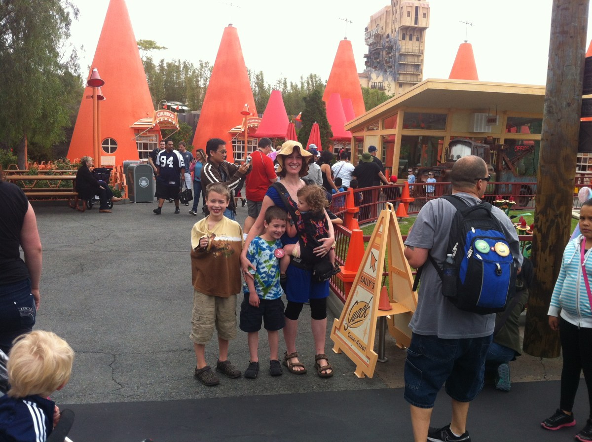 IMG_7423 Jun13 Published at 2592 × 1936 in Vacation, Phase 1: Disneyland and California Adventure ← Previous Next → Cars Land was awesome! Look at the cool cone motel just like in the movie! Also note cold arms pulled into sleeves. We really did need warmer clothes for large parts of the day (and in other parts would have been sweating, so, oh well!)